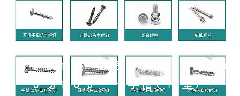 平杯)、半圓頭內六角螺釘(圓杯)、十字槽盤頭機螺釘、十字槽沉頭機螺釘、十字槽大扁頭機螺釘、十字槽盤頭自攻釘、十字槽沉頭自攻釘、十字槽大扁頭自攻釘、全牙絲桿(牙條)、六角螺母、法蘭螺母、尼龍螺母、蓋型螺母、蝶型