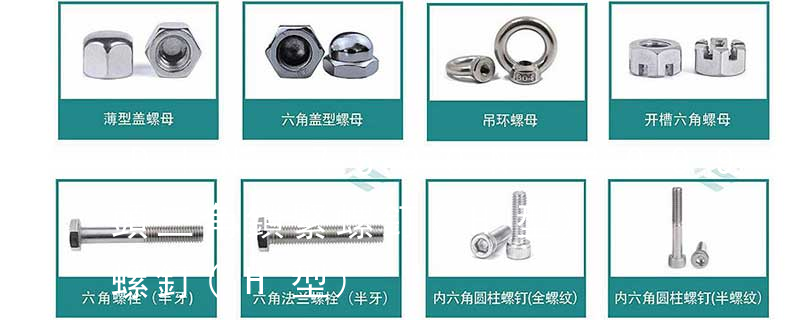 螺栓有:1、方頭螺栓,2、半圓頭方頸螺栓,3、十字槽盤頭螺釘,4、內六角沉頭螺釘,5、方螺母C級,6、蝶形螺母,7、六角頭螺栓,8、十字槽盤頭自攻螺釘。大小有M18、M6、M8、M16、M10、M12、M14、M20等型號。通常用 1、開槽圓頭木螺釘 GB 99-86 DIN96; 2、開槽沉頭木螺釘 GB 100-86 DIN97; 3、開槽半沉頭木螺釘 GB 101-86 DIN95; 4、六角頭木螺釘 GB 102-86 DIN571; 5、十字槽圓頭木螺釘 GB 950-86 DIN7996; 6、十字