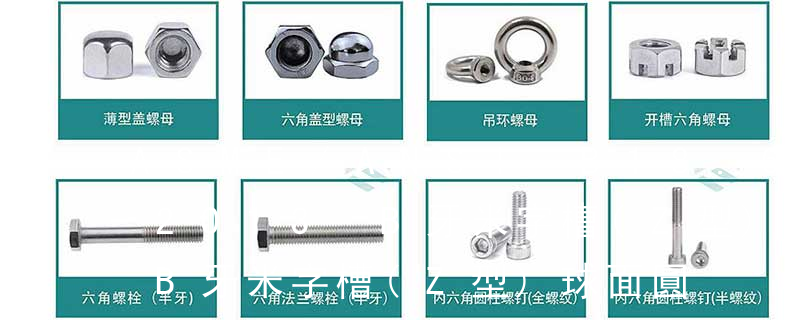 T型槽螺母 T-slot nuts 單頭螺柱 Single end studs 地腳螺栓 Masonry bolts 帶槽圓螺母 Slotted round nuts 端面帶孔圓螺母 Round nuts with drilled holes in one face 開槽平端緊定螺釘 Slotted set screws with flat