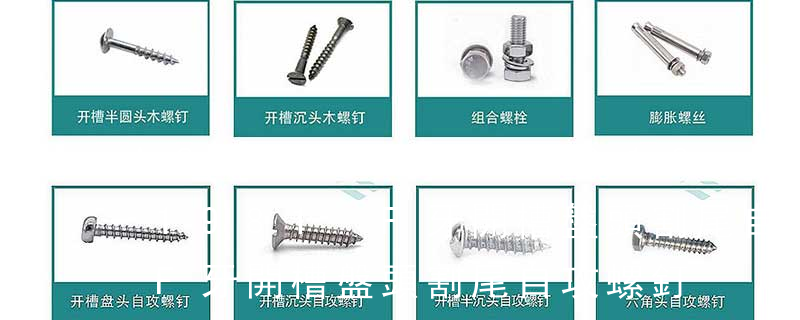 (鐵板牙自攻螺絲) B-2: Plastic Tapping Screw. (塑膠用,自攻螺絲) C: Wooden Screw : 木工螺絲 D: Drywall Screw :水泥墻螺絲 E: Self Drilling Screws鉆尾螺絲(不銹鋼鉆尾螺絲,復合材料鉆尾螺絲) F:膨脹螺絲,四片膨脹螺絲又